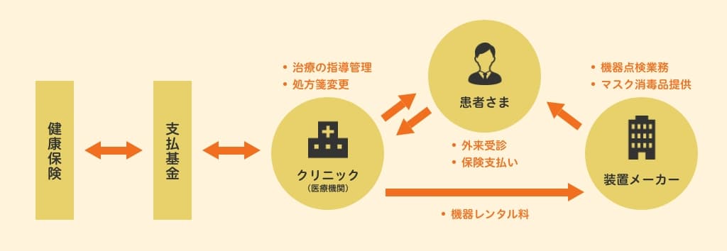 睡眠時無呼吸症候群について重症と認められた場合、CPAP治療を保険適用で受けることができます。その場合、治療の指導管理や様子によって処方箋を再検討するために、定期的な受診が必要です。